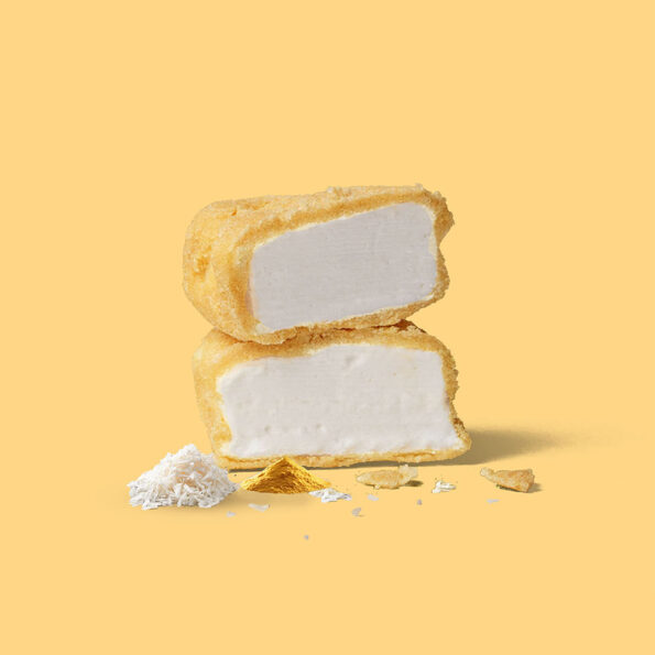 Vaniljemallows omgitt av en jevn, hvit sjokolade, fruktige toner av mango og sprøflak av kokos.